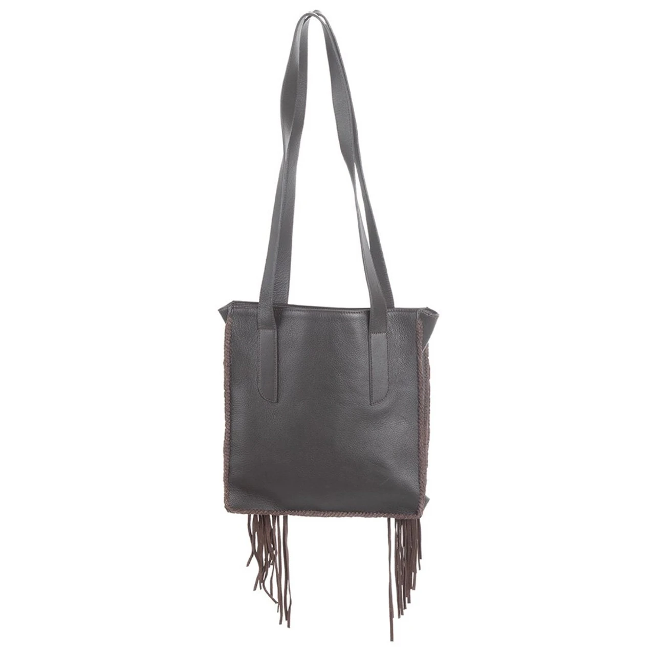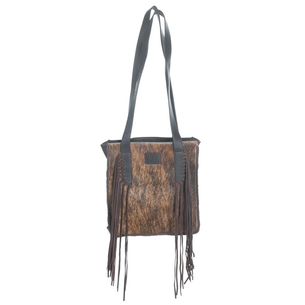 Stylish ladies Ariat Scarlett tote. Large size to give you plenty of room to carry all your needed items. Genuine leather straps and back, suede fringe on both sides and calf hair on the front.