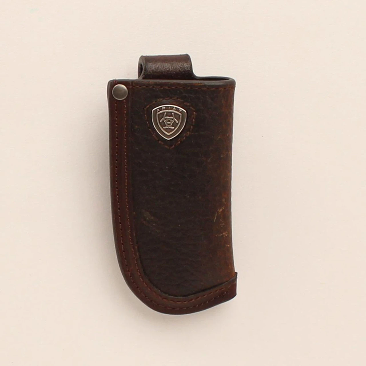 Carry your favorite knife with you every day with this Ariat knife sheath by M&F Western Products. The sheath is a quality solid color brown leather and has a silver Ariat Signature Logo concho on the front. Double stitched edges for durability. Fits up to a 1-1/2รขยย wide belt. Designed for pocket knives.