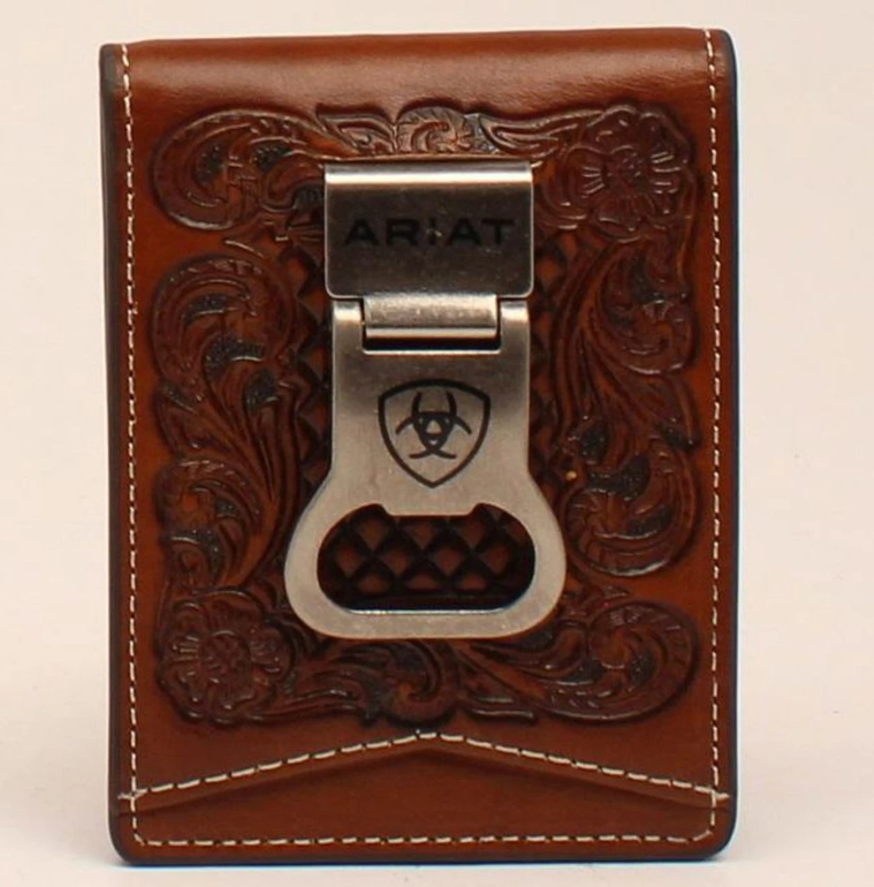 This Ariat bifold money clip by M&F Western Products has basketweave and floral embossing. Perfect for the guy who doesnât want to carry a large wallet.