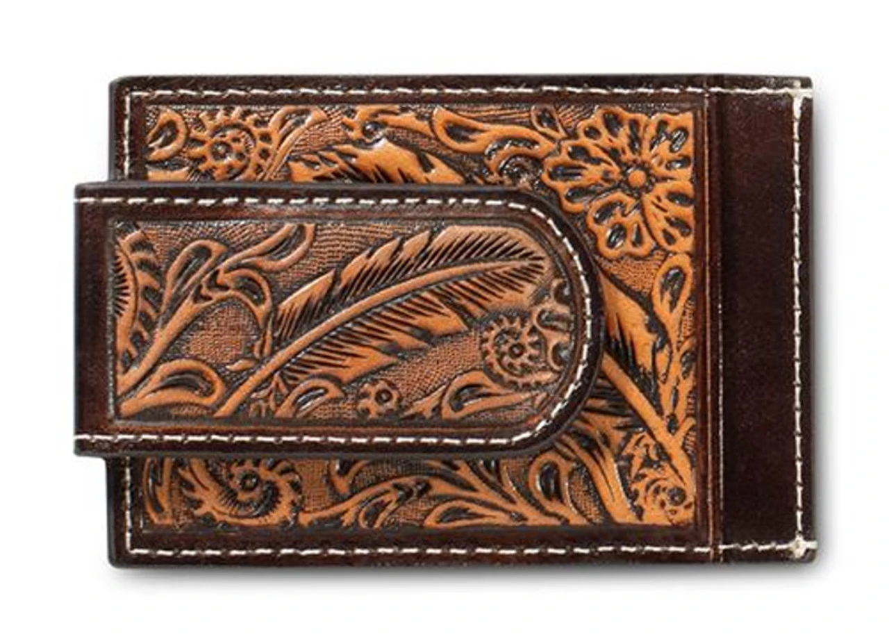 Ariat money clip wallet by M&F Western Products. This great wallet is made of genuine leather with a floral embossing and feather design on the front. Magnetic clip, ID window and multiple card slots. Ariat Mens Wallet Money Clip Style Genuine Leather Floral Embossing Feather Design Magnetic Money Clip ID Window Brown