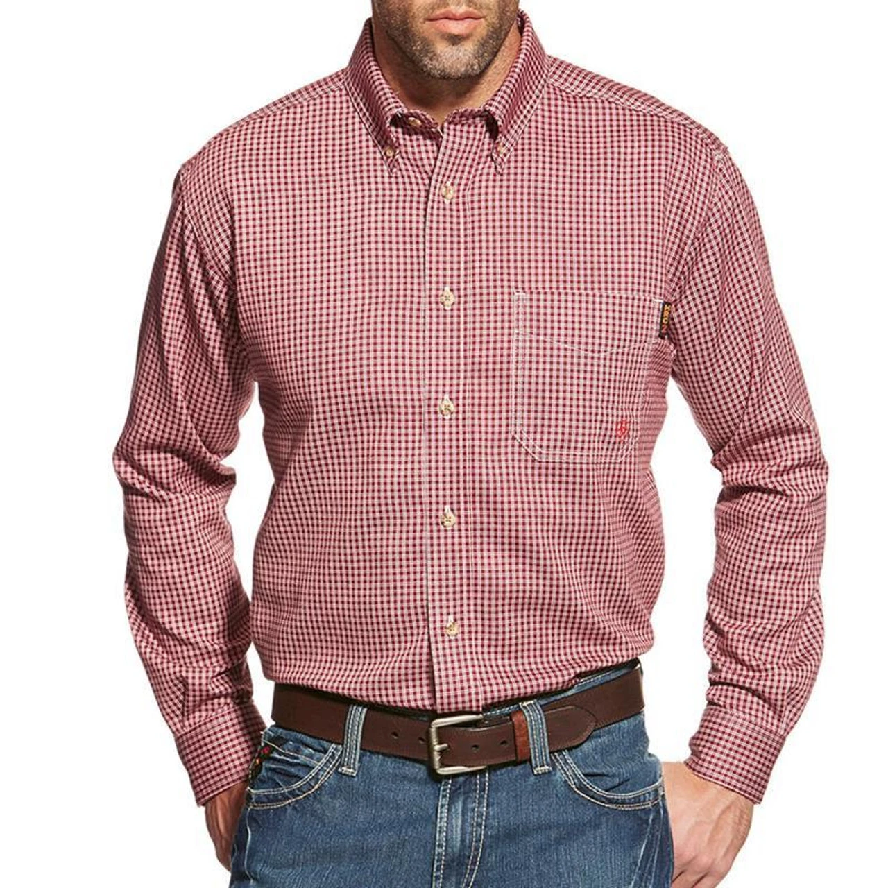AriatÂs celebrated fit and flame resistant technology available in a comfortably soft button-down workshirt. The Bells wine colored check pattern keeps you looking good for the long haul.
