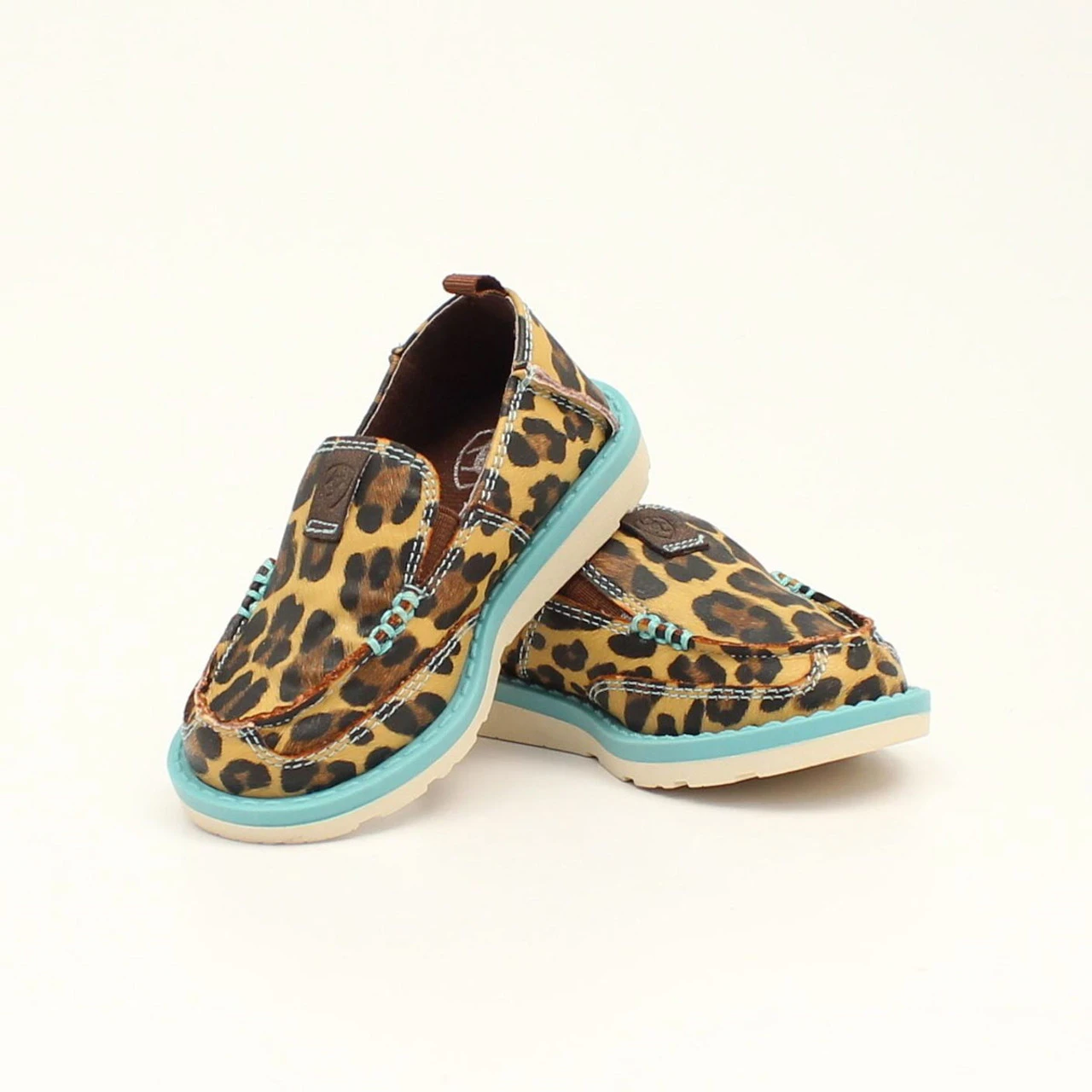 Cute and comfy describe these Ariat Cruiser casual shoes. Slip on with elastic at sides of tongue. Leopard print with turquoise stitching. Super comfortable for all day wear.
