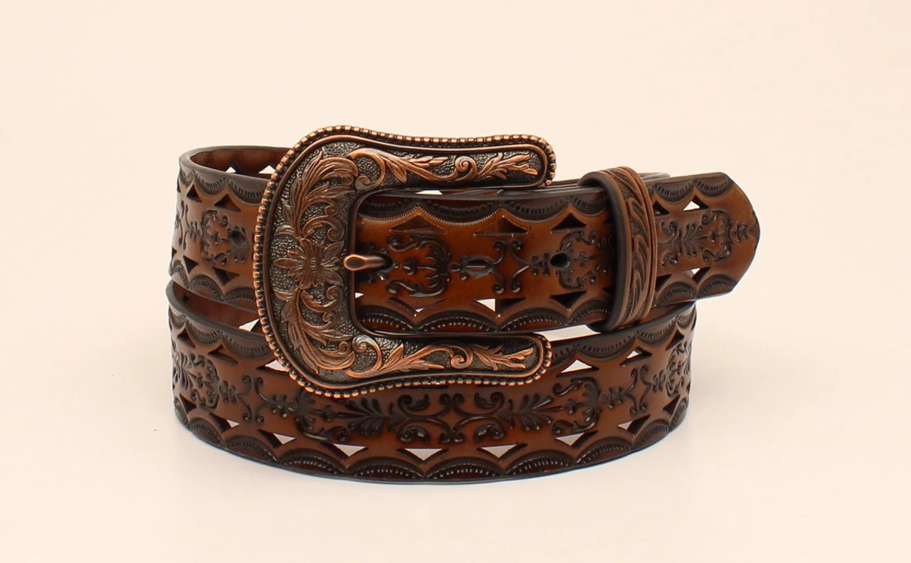 Fashionable Ariat ladies belt by M&F Western Products features a beautiful designed leather pattern with a dark copper buckle.