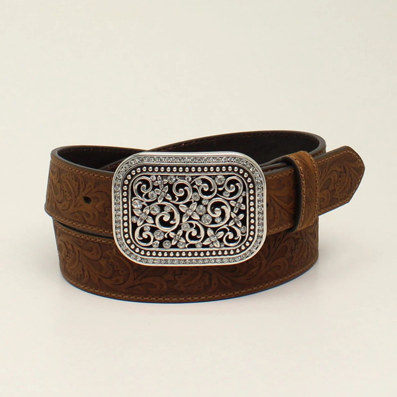 This ladies Ariat belt by M&F Western Products has a stylish western look. The strap has a floral embossed pattern that is beautifully set off with a crystal buckle. This belt is perfect for a night on the town.Sizing Guide: Ariat belts are measured from the end of the strap on the buckle side to the center of the middle hole. The best rule of thumb is to buy a belt 2â larger than your waist/pant size.