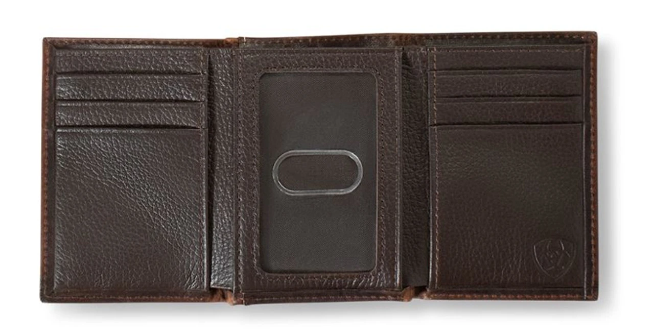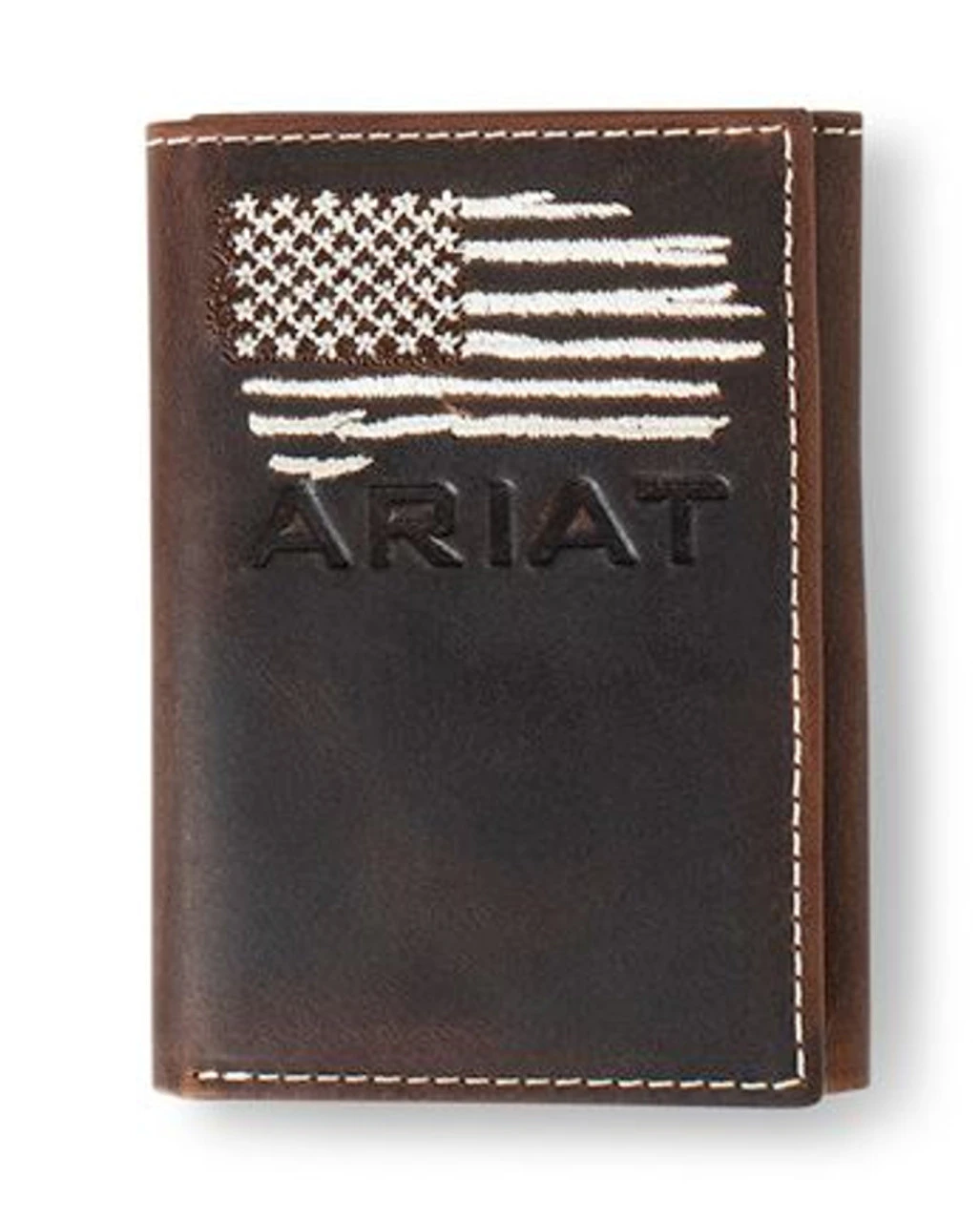This Ariat trifold wallet by M&F Western Products has a genuine distressed brown leather body with an embroidered American flag in white and brown. Ariat name below it. The Inside has a black nylon lining, with credit card slots and a clear ID pocket. Ariat Mens Wallet Distressed Brown Trifold Style Genuine Leather American Flag Ariat Name Multiple Card Slots