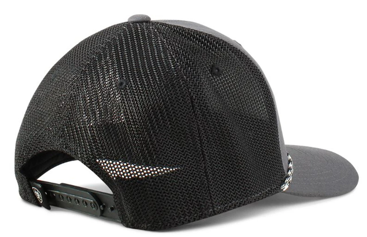 Ariat menâs Flexfit cap by M&F Western Products. Front two panels are designed with the Ariat logo and red, white, and green Aztec design. Black and white rope accented around the bill. Black mesh back with snap back closure. Ariat Mens Flexfit 110 Cap Grey with Black Mesh Back 98% Polyester, 2% PU Spandex Snap Back Closure Structured Ariat Logo 6 Panel