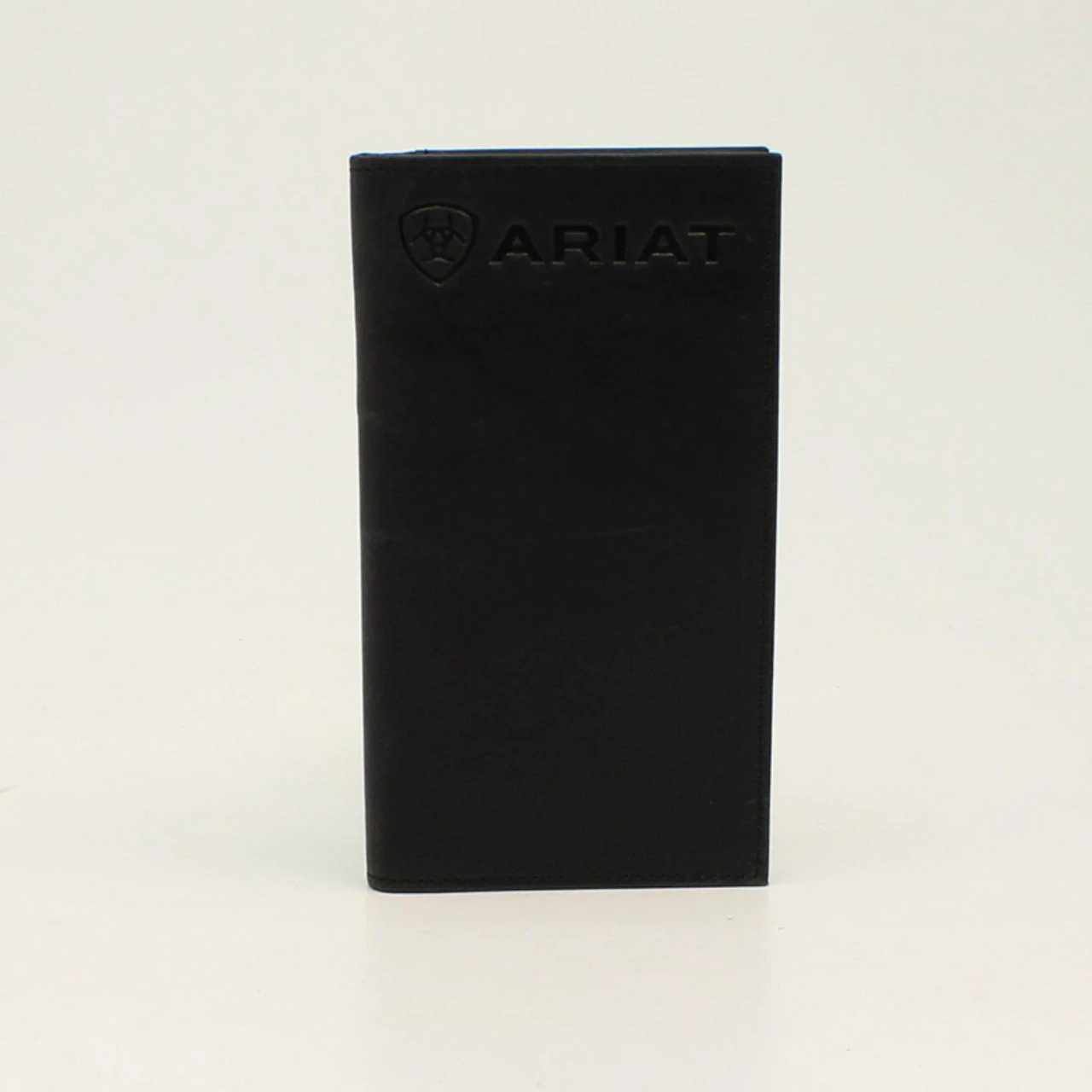 Stay organized with this rodeo style Ariat wallet by M&F Western Products. Genuine leather with an Ariat logo and shield across the top. Features multiple compartments for your credit cards, cash and ID.
