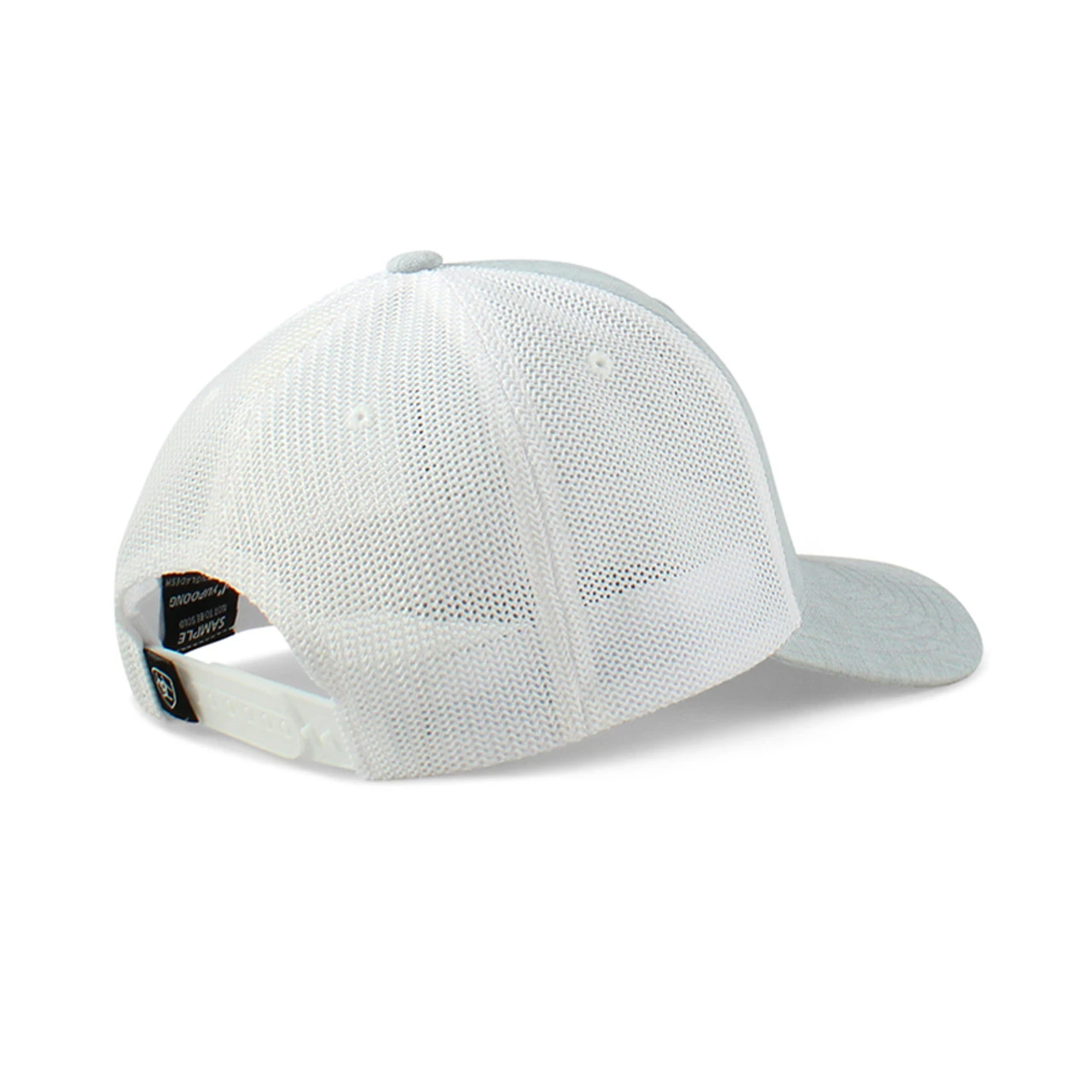 Ariat menâs Flexfit cap by M&F Western Products. Rubber patch with blue embossed Ariat name and logo over blue-grey fabric with a blue-grey bill. White mesh back with snap back closure. Ariat Mens Flexfit 110 Cap Blue-Grey Cap with White Mesh Back Ariat Logo Snap Back Closure 6 Panel High Profile Structured 96% Polyester, 4% Polyurethane (PU)