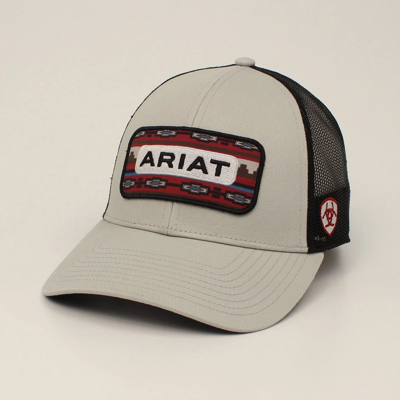 Comfortable Ariat menâs cap by M&F Western Products. B fit style in grey front panels and bill. Ariat logo embroidered on rectangle patch with southwestern pattern. Black mesh back panels with snapback closure for a perfect fit.