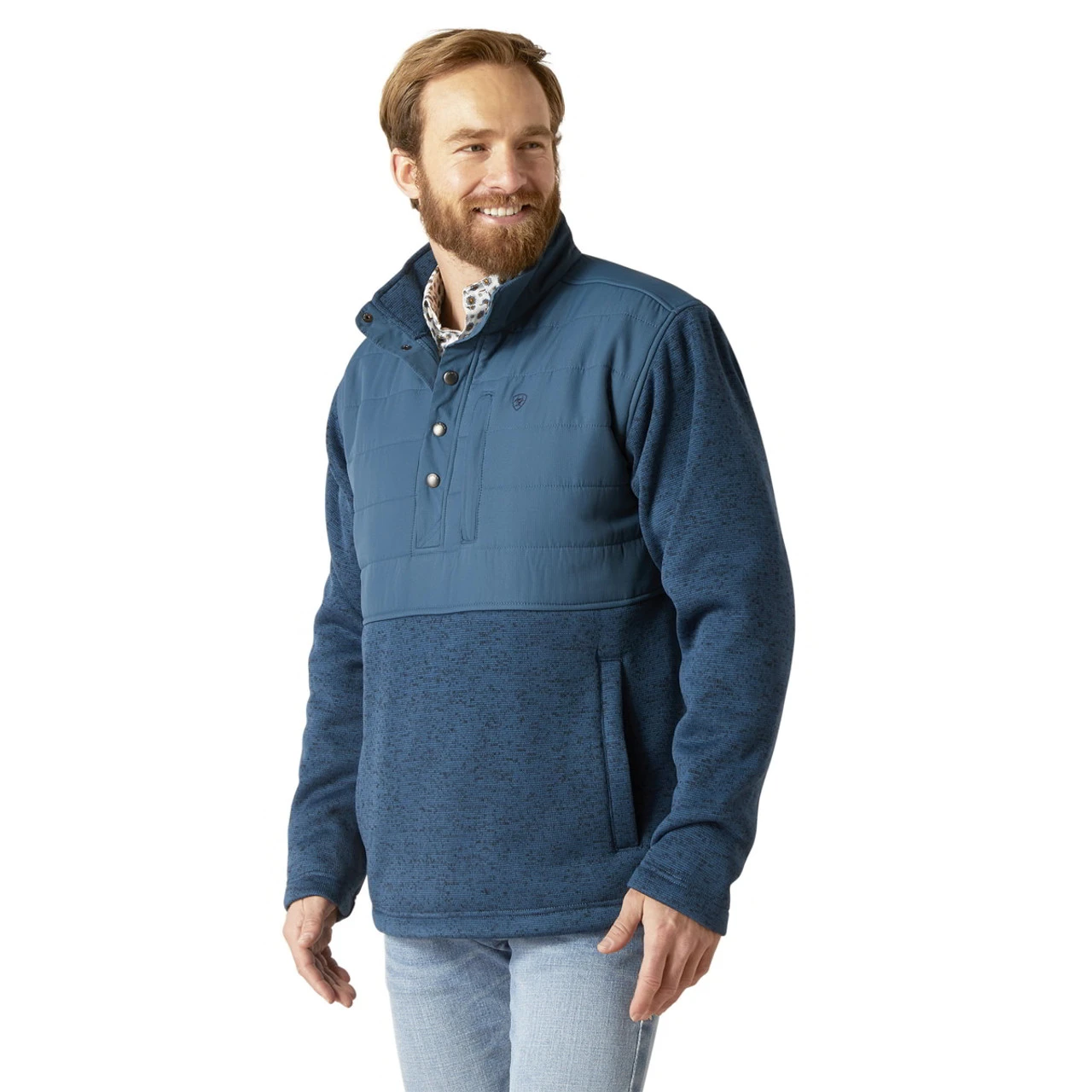 - Sweater fleece blocked with a woven fabric chest yoke