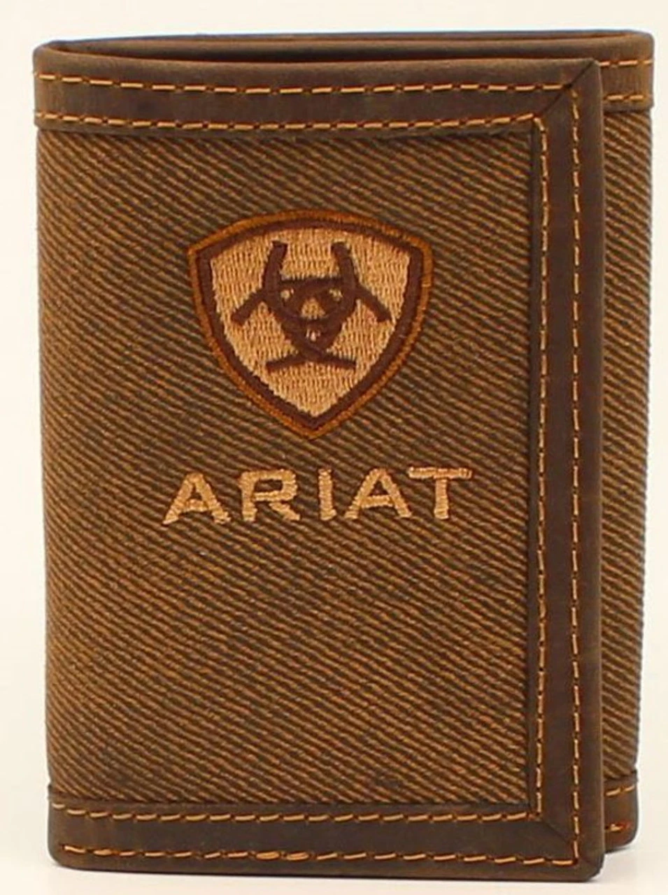 Ariat trifold wallet by M&F Western Products. This great wallet has an oilskin cotton front and an embroidered Ariat text and shield logo. clear ID slot, credit card slots, removable photo slip, and cash pocket. You will be proud to carry this quality wallet every day.