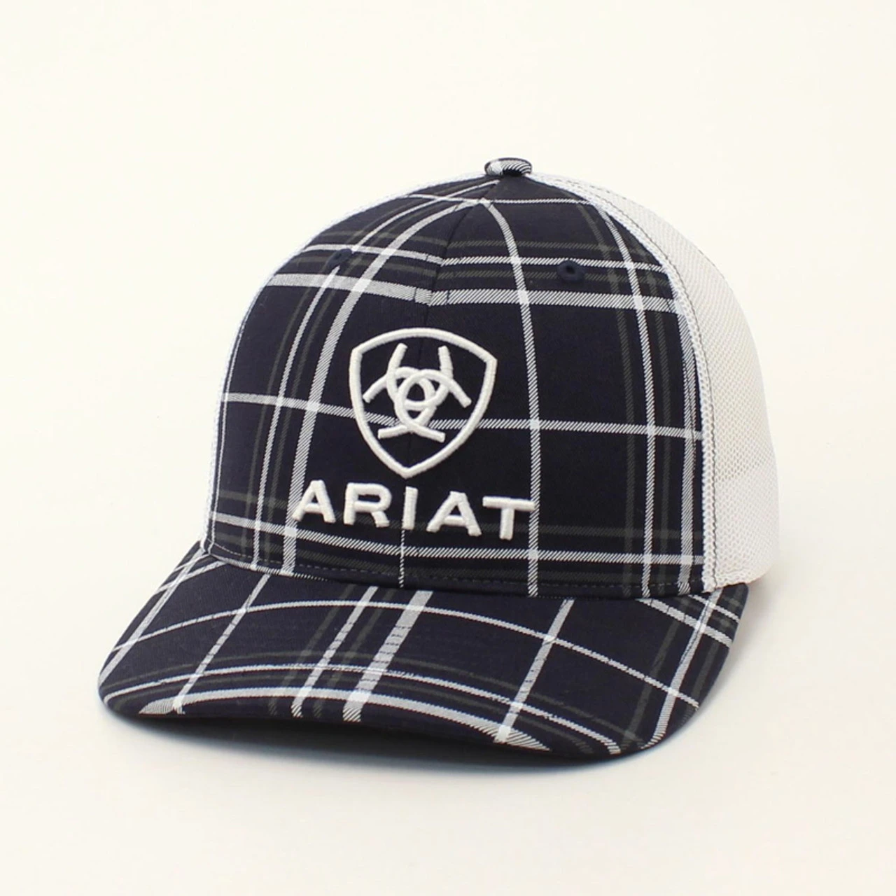 Comfy Ariat mens R112 cap by M&F Western Products. Front panels and bill are navy and white plaid with a white embroidered Ariat logo. White mesh back panels with snapback closure for a perfect fit.