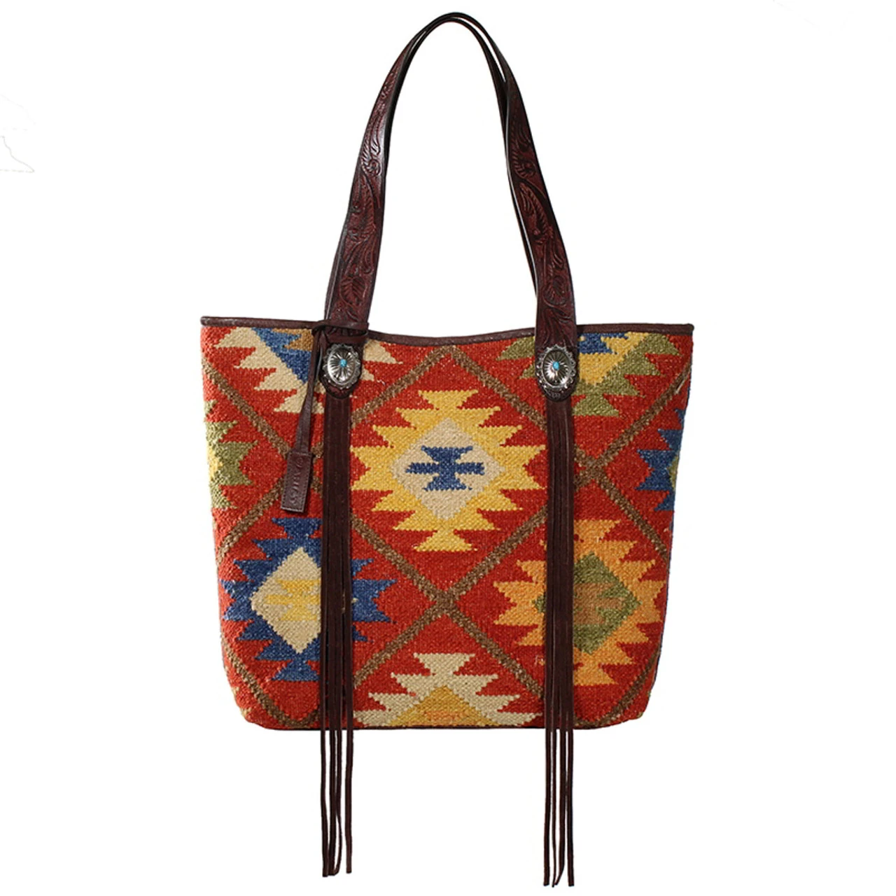 Ariat ladies conceal carry tote from the Brynlee collection. Aztec rug pattern design. Leather strap with fringe. Zipper closure.