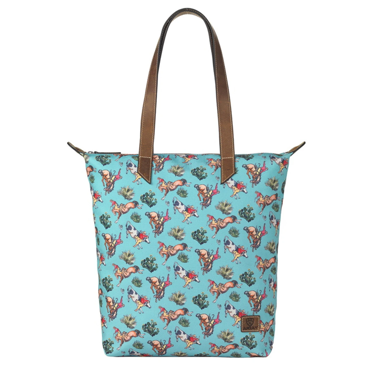 Be in style with this Ariat cruiser matcher tote by M&F Western Products. It is made with a vintage print material that has broncs, cactus, cows and tumbleweeds. Two zip pockets, one on the inside and one on the back. Zip top closure for security. Ariat logo patch on the bottom right. Measures: 16-1/2 x 15-1/2 x 6.