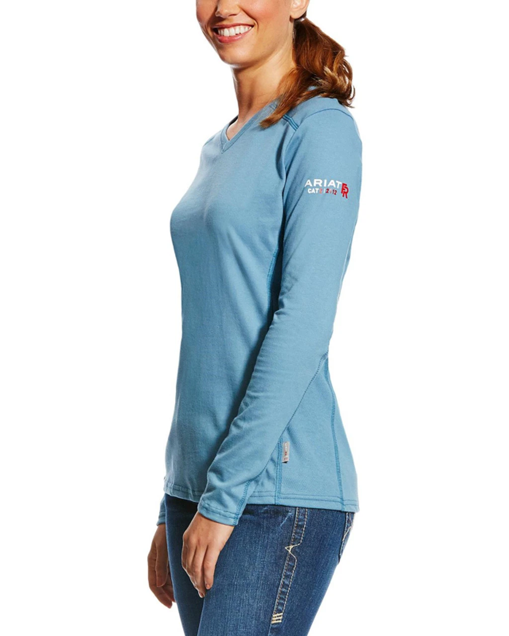 Durable and Comfortable. This Ariatร Air shirt is steel blue with long sleeves. It’s flame resistant, has a v-neck. CAT2 / 2112. 88% Cotton / 12% Nylon – Machine Wash88% Cotton / 12% Nylon
