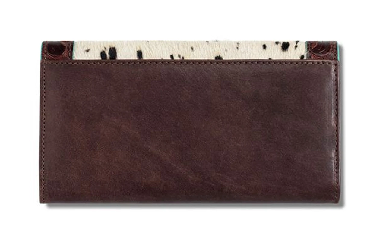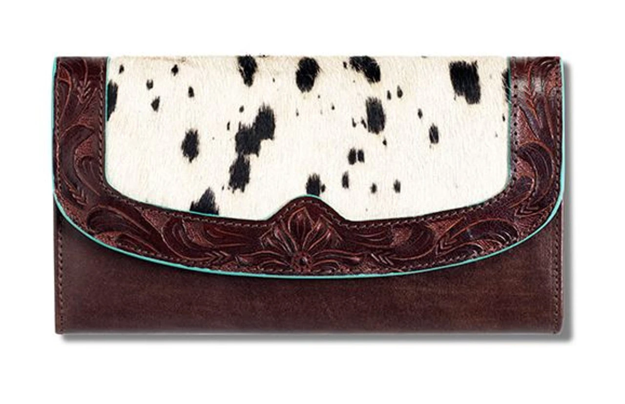 Ariat ladies wallet from the Willa collection. Plenty of room for your credit cards, with 12 slots. One zipper pocket. Top flap is covered in calf hair and features a tooled outer border. Ariat Wallet Brown Leather Body with Calf Hair Willa Style Turquoise Trim Magnetic Closure 60% Leather, 40% Hair On Measures: 4-1/4 x 7-1/2 x 1