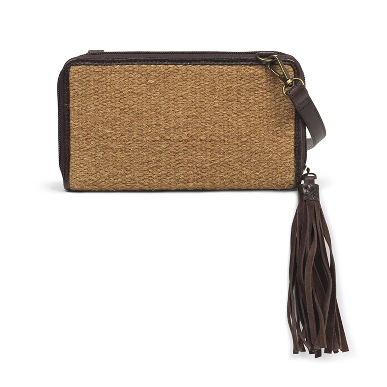 Ariat ladies crossbody wallet from the Nellie collection. There are 12 slots for cards and one zipper pouch for coins. The body of the wallet is designed with a rug fabric in an Aztec print with a floral tooled yoke. Adjustable strap. Ariat Crossbody Wallet Nellie Style Brown Aztec Print Zipper Closure Adjustable Strap 13 card slots including ID window Embroidered Ariat logo 40% Leather, 20% Dari, 20% Suede, 20% Canvas Measures: 4-1/4 x 7-1/2 x 1